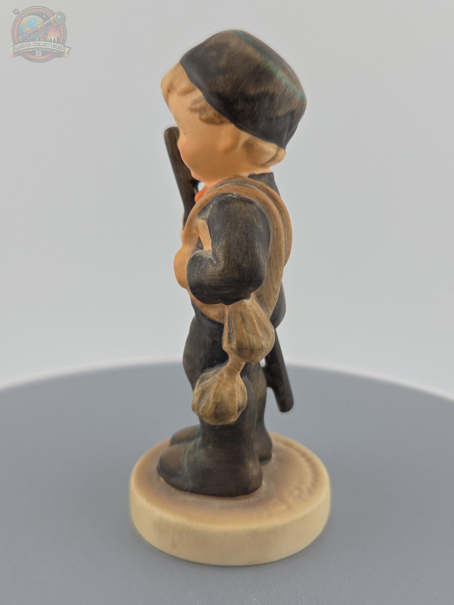 The figurine showcases soft facial features, muted earth-tone coloring, and intricate detailing on the clothing and accessories. The ladder and bag add character and storytelling to the piece, making it a standout addition to any Hummel or vintage porcelain collection.
