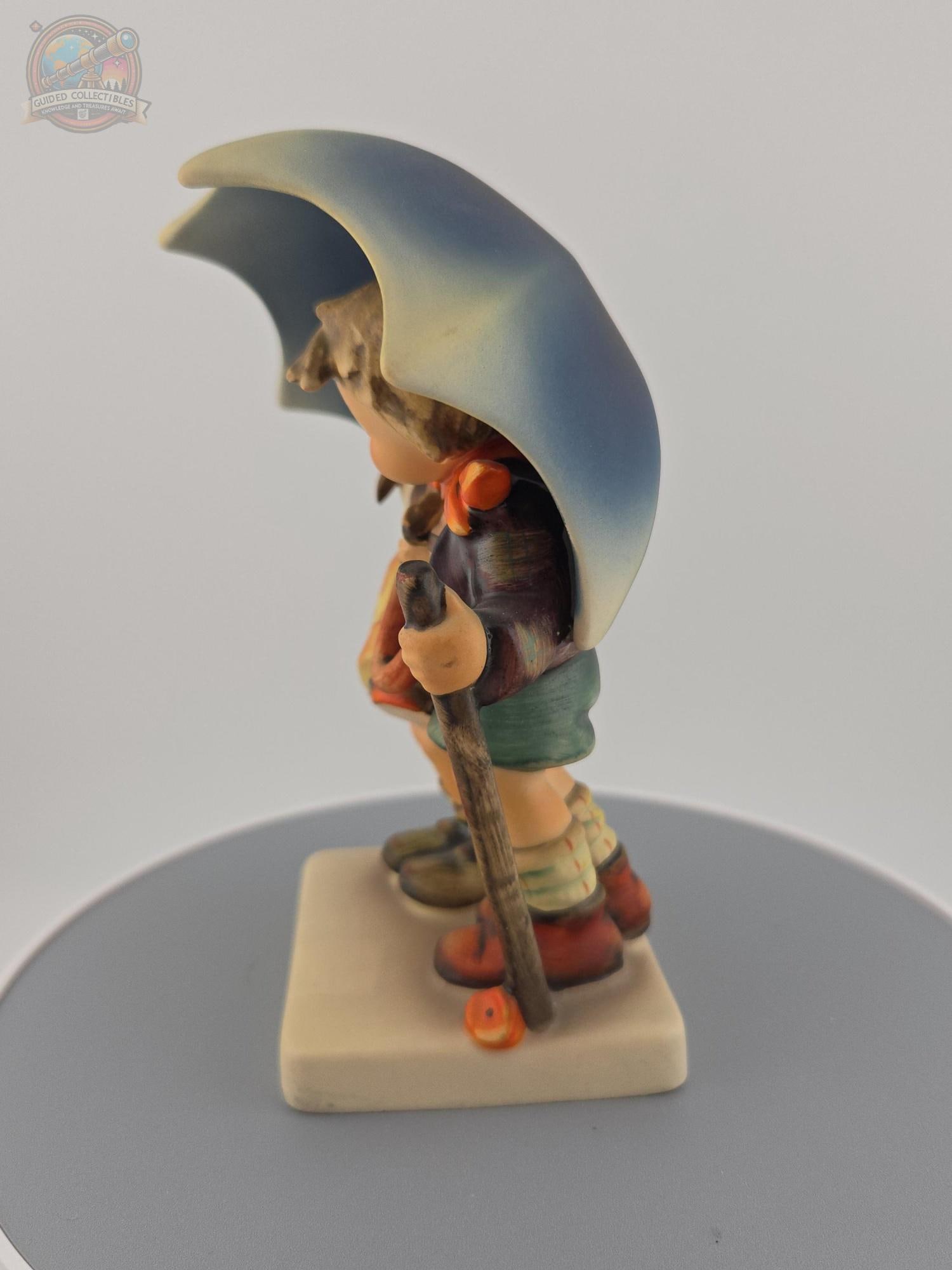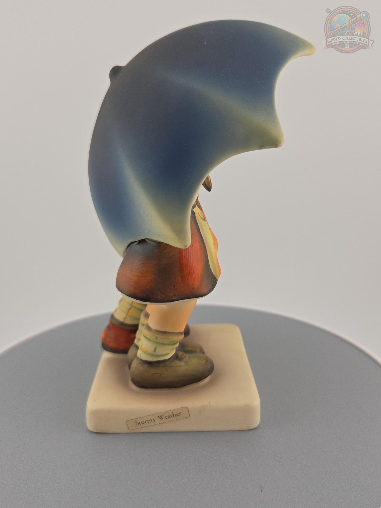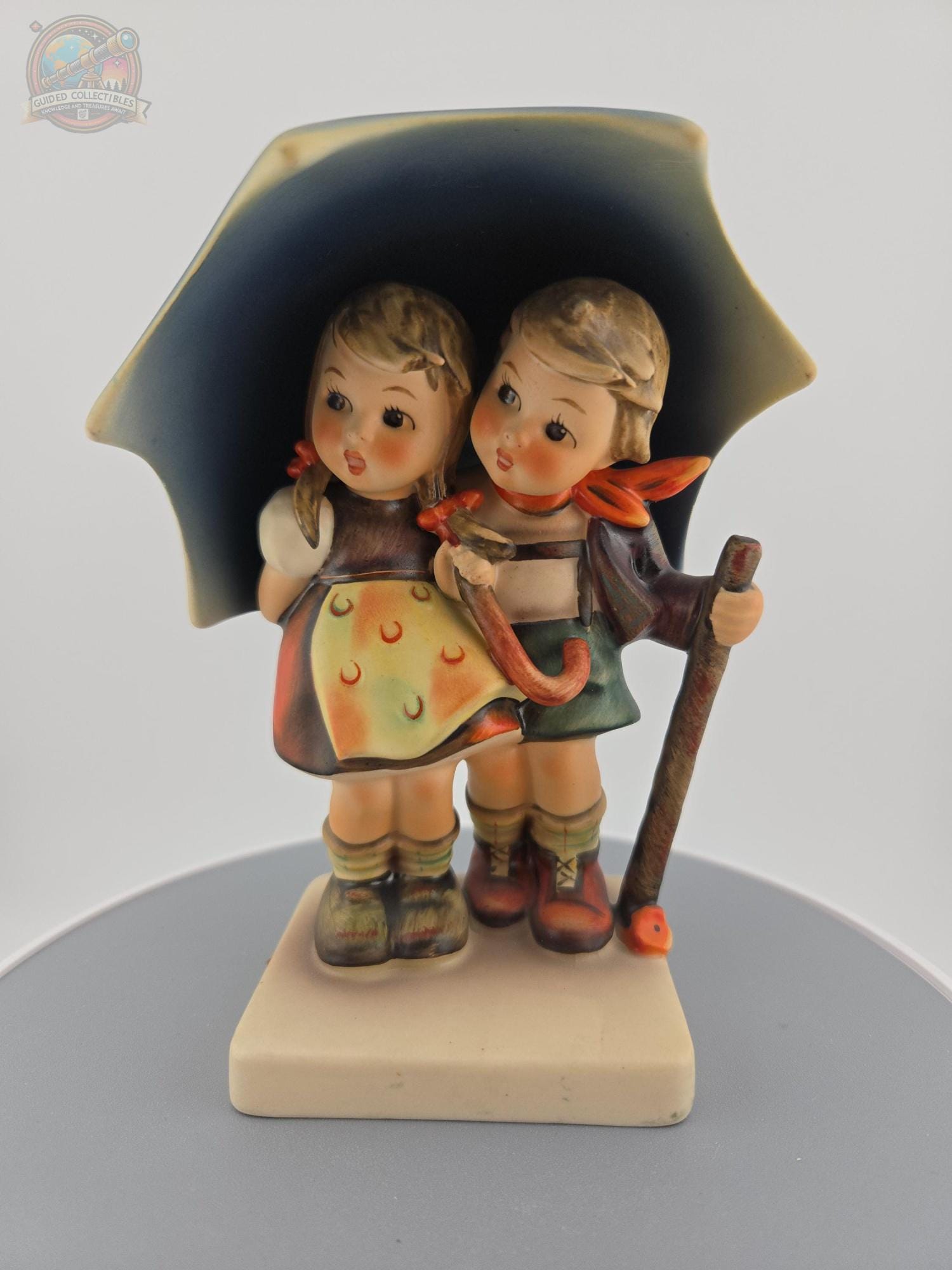 Discover a charming piece from the 1970s, the Hummel Figurine titled 'Stormy Weather.' This delightful scene captures two children sharing an umbrella under a stormy sky, exuding warmth and togetherness.