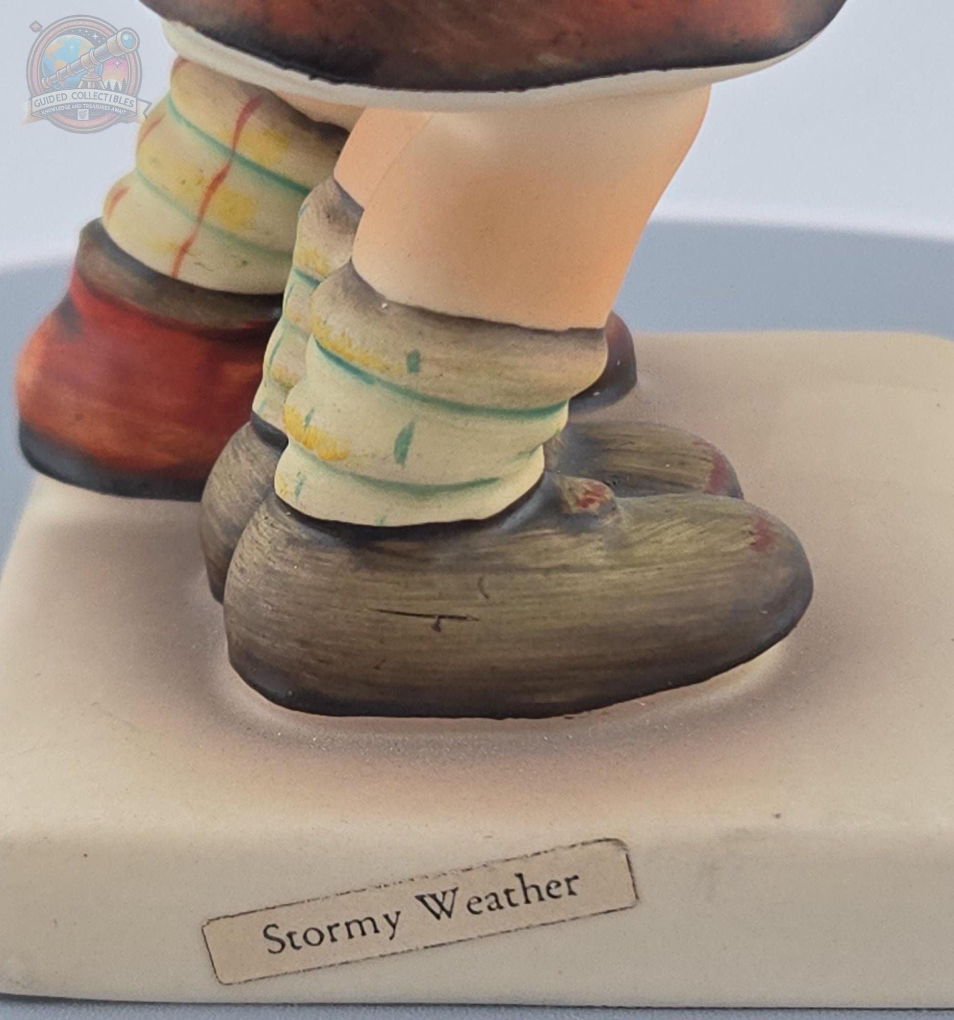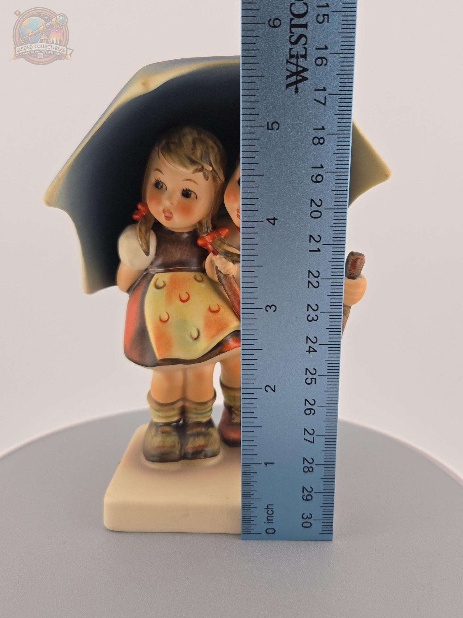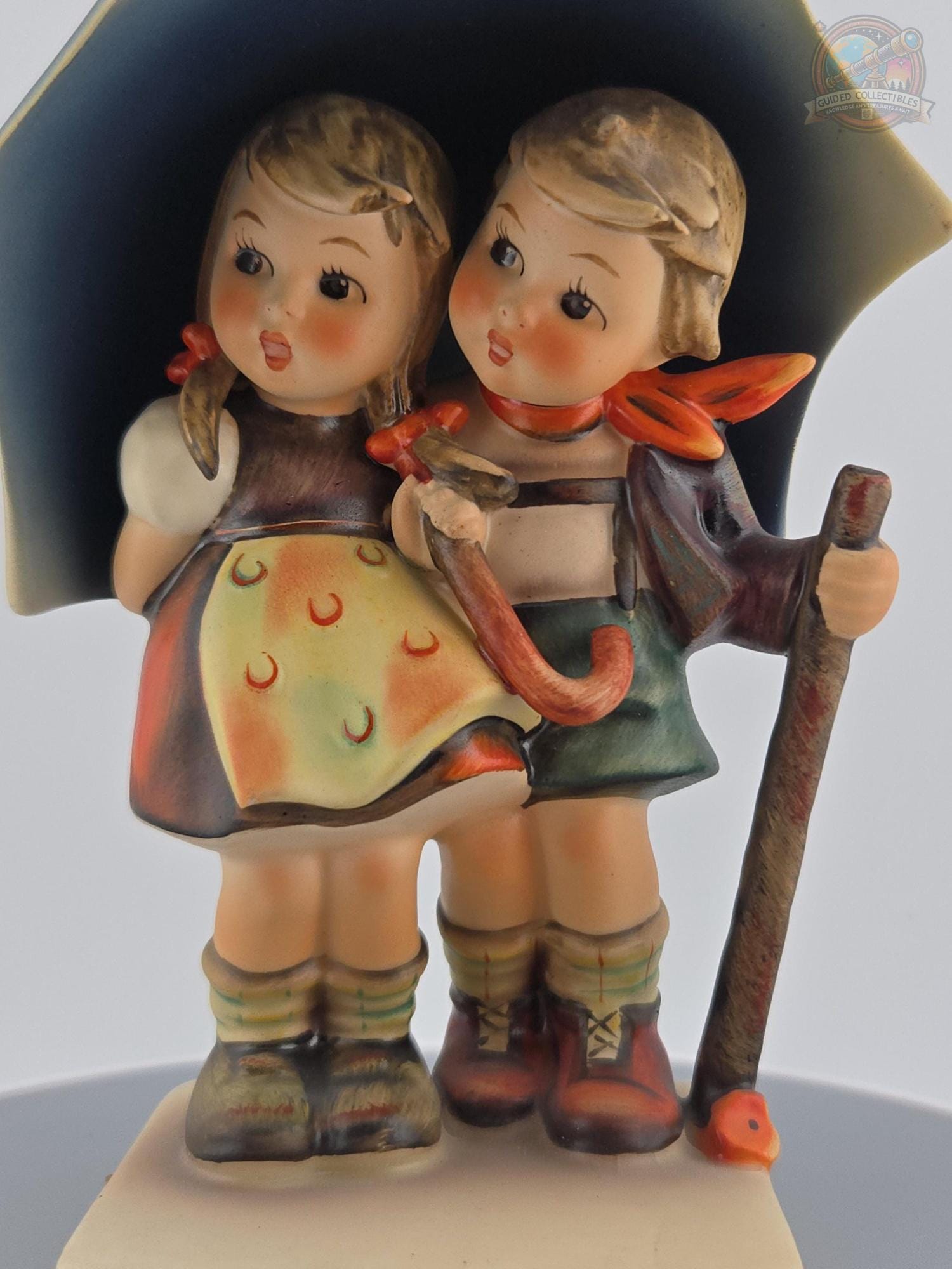 Key Features: Brand: Hummel Pattern: Stormy Weather Material: Ceramic Origin: Germany Size: Approximately 5.75" tall Design: Two children sharing an umbrella Markings: Hummel logo Condition: Excellent, minor wear from age